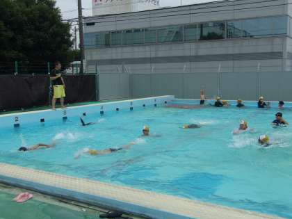 プールの横幅を使って、けのびやバタ足、フリーなど、いろいろな泳ぎを試しています。