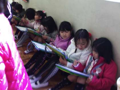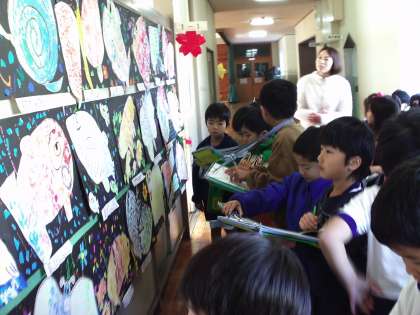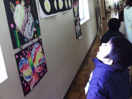 野菜スタンプを使った作品を鑑賞し合いました。お友だちの作品をじっくり観て、よさを見つけ合いました。先生は二つ選んでっておっしゃったけど、どれもすてきで、迷っちゃうねぇ。