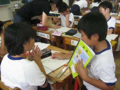 まだ、定義がぴんとこないのか、平行を見つけ出すのに苦労している子どもたちも多くいました。先生に助けてもらったり、友達同士確認したりして学習を進めていました。
