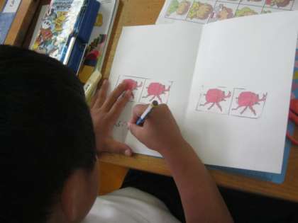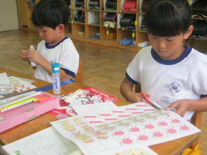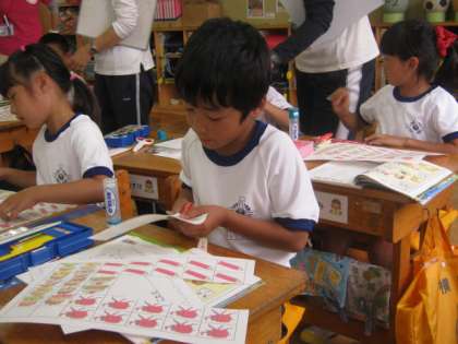 先生のお手本を見て、子どもたちは(あんなふうに作りたい!)と意欲を持ちました。自分で選んだ物を好きな数だけ使って絵本にするのも、子どもたちにとっては楽しい学習でした。