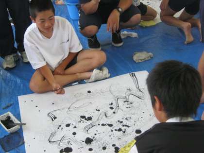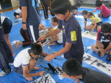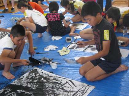 子どもたちは、筆だけでなく、はけやブラシ、霧吹きやスポイトなど、様々な道具を使い、大きさも材質も違う数種類の紙から表現したいことに合う用紙を選んで、アートをつくりました。