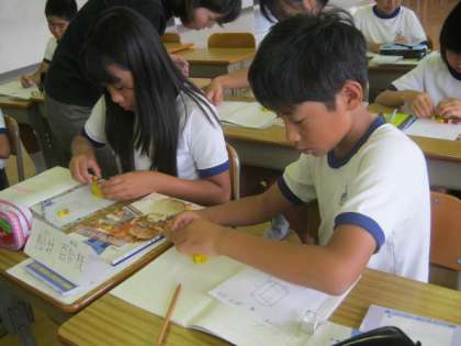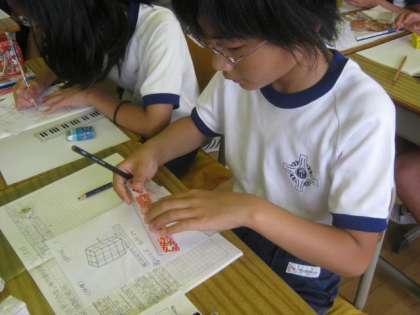 5年生の、算数少人数学習です。今日は、直方体の体積を求める公式を導きだしていました。各自が、1立方cmの積み木をもとにしたり、図に線をひいたりして、考えていました。
