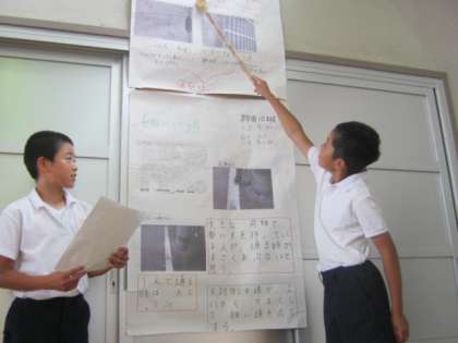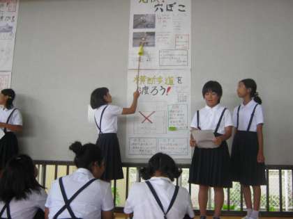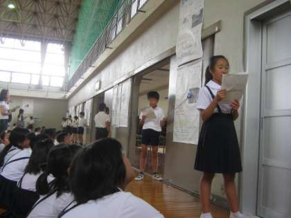 6年生は、居住地区ごとに班をつくり、実際に現地に出かけて自分たちの目で確かめたり、写真を撮ったり、インタビューや実態調査などをしてきた班もありました。それを、大きなポスターにまとめ、今日は、ポスターセッションのかたちで発表しました。