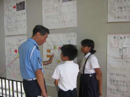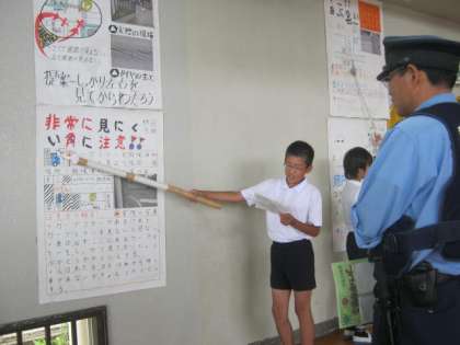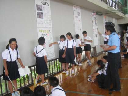 友達やお客様を前に、子どもたちは緊張した面持ちで発表しました。どの班も、身近な危険箇所を自分たちの視点でよく調べてありました。聴く側の子どもたちも、真剣な表情で聴き入っていました。