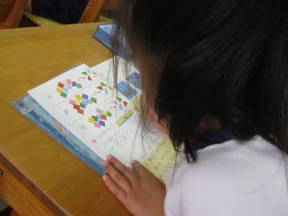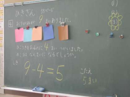 引き算を使う文章問題にも挑戦中です。問題を読んで、式を立てて、答えを出して。一人でもできるかな。