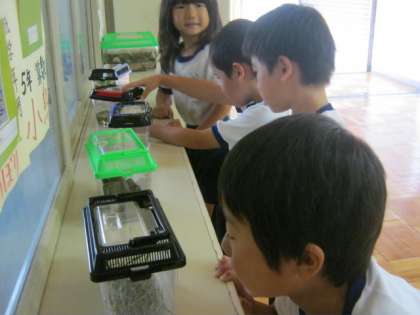 1年生の生活科です。子どもたちが持ち寄った身近な生き物をきつつきホールに集め、みんなで観察していました。オタマジャクシ、カミキリムシ、ダンゴムシ…。子どもたちは虫かごに顔をくっつけるようにして、観察していました。