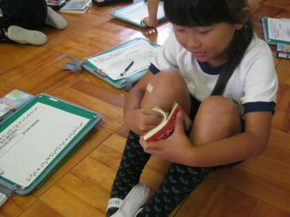 よく見たら、観察カードにかきます。中には、図鑑で詳しく調べながらかいている子もいます。