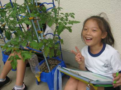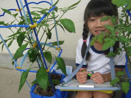 中:今日、ピーマンを2個収穫します。おいしくお料理してもらってくださいね。