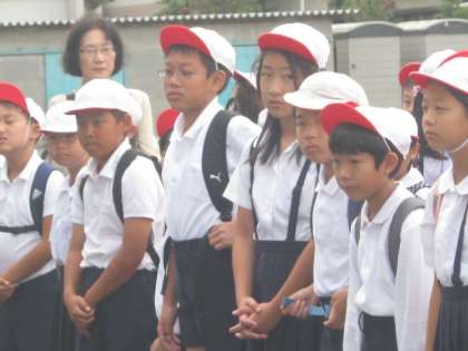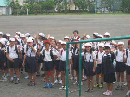 いよいよ出発。見送ってくださる事務室に手を振ります。3階から「行ってらっしゃい。」の声は、6年生の見送りです。