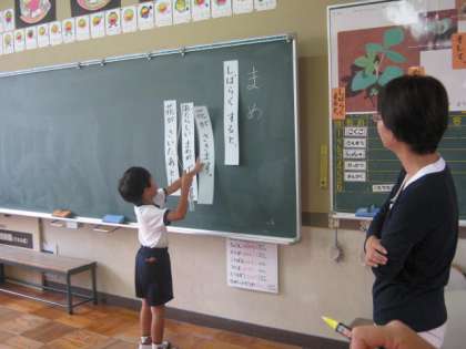 今日の学習は、説明文「まめ」の読み取りです。まずは、全員で本文を音読しました。内容をある程度理解しているからこんなふうに読めるんだと感じさせる、読み方でした。次に、花が咲き豆が実る順番を、カードを並べ替えて確認しました。