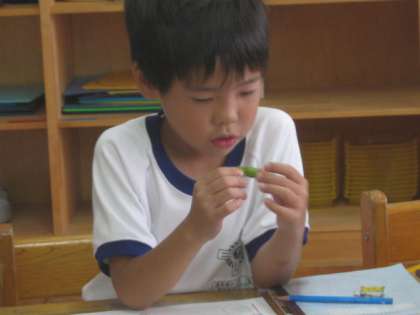 先生が、おうちの畑から枝豆を根っこから取ってきてくれました。子どもたちは、切り分けてもらった一さやの枝豆を見ながら、自分の考えをまとめていました。実際のさやを見たり触ったりしているうちに、新しい赤ちゃん豆が、さやで守られていることに気づきました。
