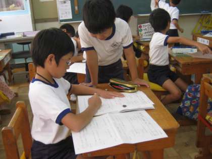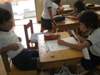 3年生の算数では、先にできた子が、お友達のプリントに丸付けをしてあげてしました。顔を寄せ合うようにしている組もあれば、丸をつけてもらっている方が態度が大きい組もあり…。仲良く学習しているから、まあ、いいか。