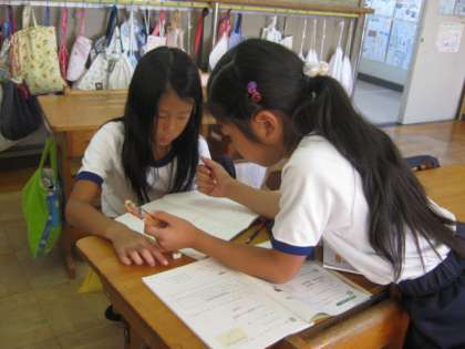 子ども同士が丸付けをし合い、教え合う姿も見られます。教える側も、教わる側も、学習が深まっていきます。