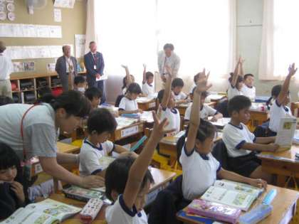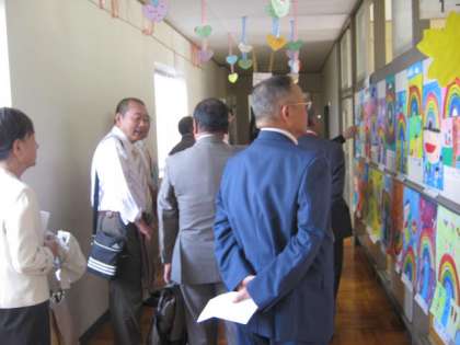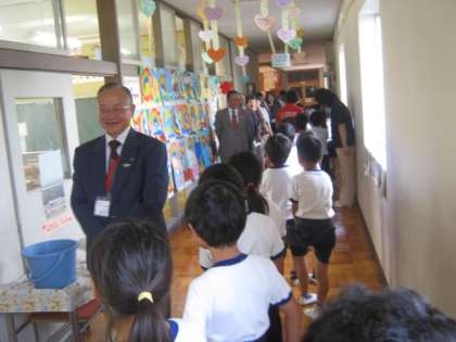 1年1組は、背の順1列の並び方を学習していました。ちょうど廊下に1列に並んでいたので、お客様をあいさつでお出迎えしました。子どもたちの学習風景や廊下の掲示物も、熱心にご覧いただきました。