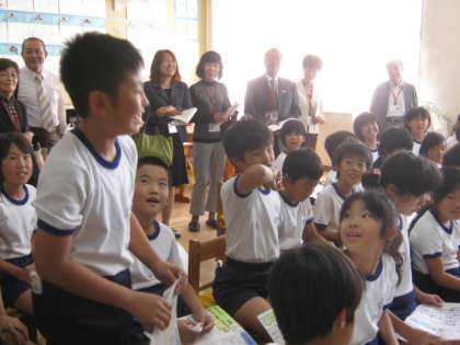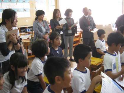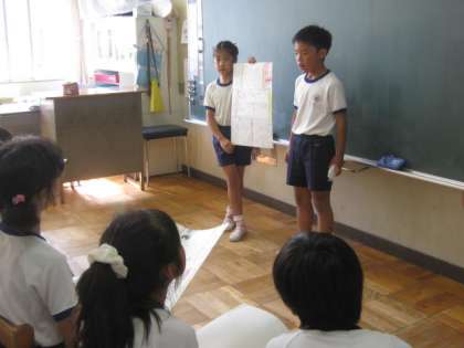 4年生のこのクラスは、都道府県新聞の発表会をしていました。観客はクラスのお友達だけのはずだったのに、急にたくさんのお客様が見えてきっと緊張したでしょうね。でも、とても落ち着いてわかりやすく発表出来ましたよ。感想を言う子も、よく聴きよく考えていることがわかりました。