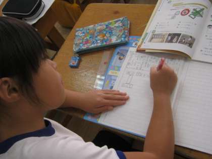 3年生の算数では、直線距離と道のりを学習していました。2回角を曲がる経路では、3つの距離を足すのですが、それを読みとるのも足し算するのも、3年生にとっては簡単なことではないようです。