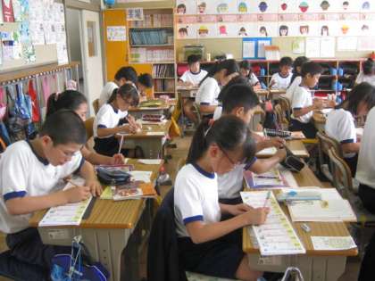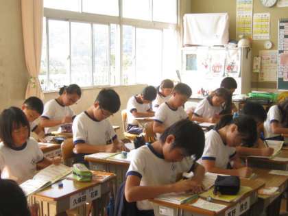 こちらの5年生の国語では、新出漢字を学習していました。真剣になればなるほど、目がドリルに近づいてしまいます。姿勢をよくして書くよう、指示が出されていました。