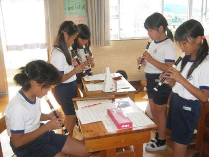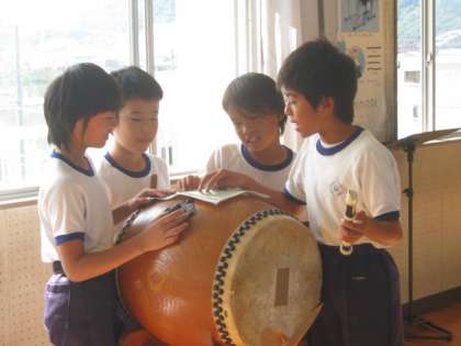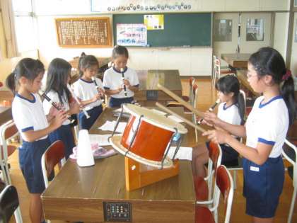 軽快なお囃子の音に誘われて音楽室に行ってみると、4年生でした。班ごとに、自作のお囃子を演奏していました。まだ練習段階ですが、かなり本格的です。はじめ、一人一人が節を作っていたころと比べると、完成度の高さに驚かされます。