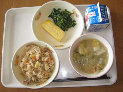 今日のメニューは、秋の味覚の炊き込みご飯、厚焼き卵、葉大根のゴマ炒め、タマネギと厚揚げのみそ汁です。