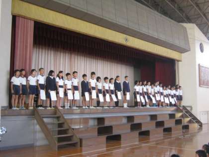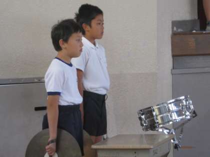 ステージ下にはナレーション担当と雰囲気を盛り上げるドリル隊がスタンバイ。ステージ上には、スローガンが書かれたカードを手に、前期後期の児童委員が並びました。