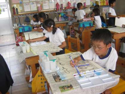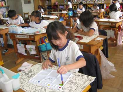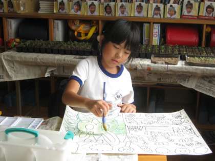2年生が、お話の絵を描いていました。テーマは、森のお菓子屋さん。かわいい動物たちとおいしそうなお菓子がたくさん登場していました。完成が楽しみです。