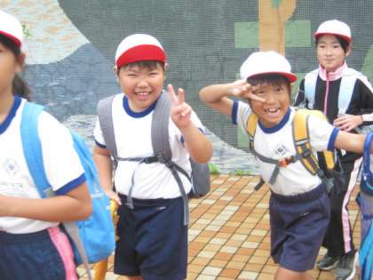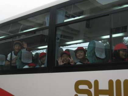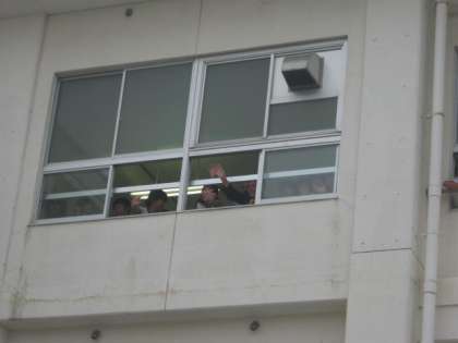 3階の家庭科室で授業をしていた5年生が、3年生の声に気づき窓から手を振ってお見送りをしてくれました。