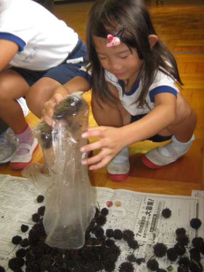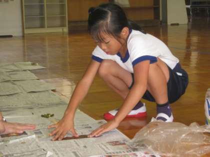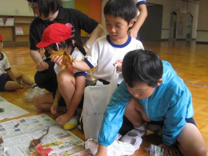 お山で拾ってきたお土産は、きつつきホールで乾かします。ふれあいパークで使えるものが、たくさんありそうです。
