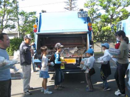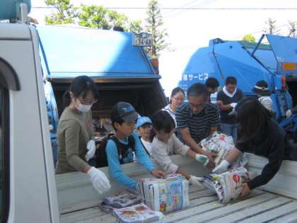 積み降ろしには、子どもたちも協力してくれました。「のど乾いたぁ」「手が痛くなってきた」という子もいましたが、みんな汗をかきながら雑誌や空き缶をせっせと運んでくれました。