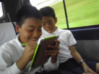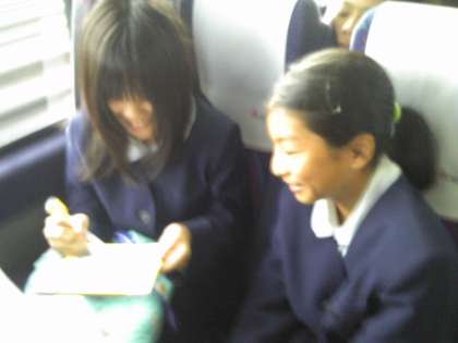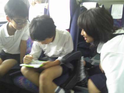 班別似顔絵描きゲーム。お題は潤先生です。車酔いする子はおらず、みんな元気です。もうすぐ海老名です。