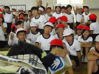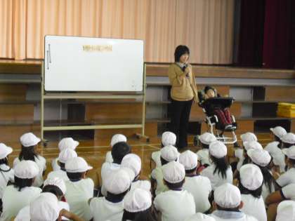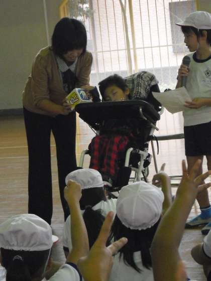 居住地交流ということで、東部特別支援学校の友達と4年生とで交流会を行いました。友達の紹介や「一緒に来ている先生にではなく、本人に話しかける」「何かをする前に話しかける」などの話の後、実行委員の司会でじゃんけんゲームやダンスなどを一緒に楽しみました。