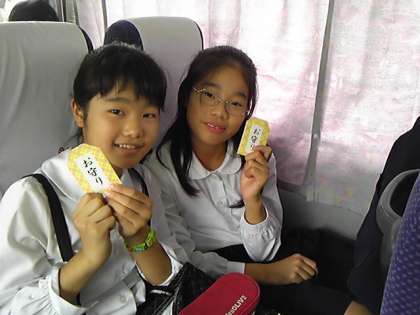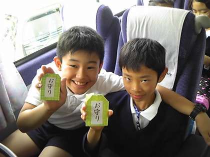 五年生が作ってくれたお守りが、一人一人に配られました。開いてメッセージを読んだ六年生は、みんな笑顔です。五年生ありがとう。
