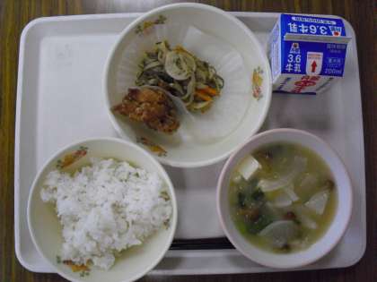 本日の献立です。麦ごはん、牛乳、鶏の唐揚げ、昆布と切干大根の煮つけ、なめこの味噌汁です。煮つけの優しい味にほっとします。子どもたちは唐揚げに大喜びです。野菜もたくさんで、食べると元気になりそうです。