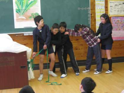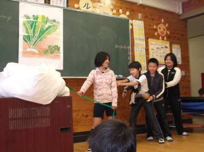 大きなかぶを見て、びっくりするところや助けを頼んで了解するやりとりなど、班ごとに工夫が凝らされています。