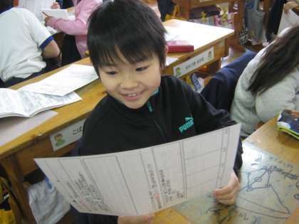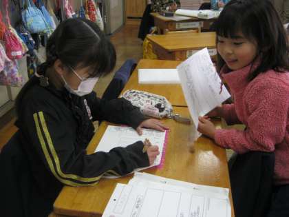 出来上がったら、ペアで読み合います。友達の作品に挑戦するのはとても楽しそう! 「むずかしいのができたね。」「ここをこうすると、もっと言いにくくなるよ。」と、互いに感想を伝えたりアドバイスしたりしました。