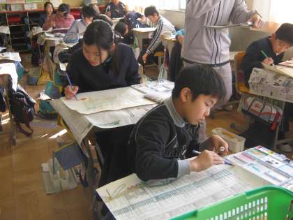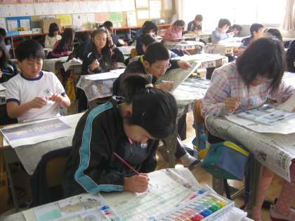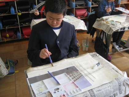 5年生の図工です。全体に、淡く柔らかい色づかいで、校舎を描いています。
