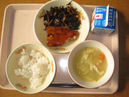 <献立>麦ご飯 サンマのかば焼き ひじきの炒め煮 みそ汁 牛乳