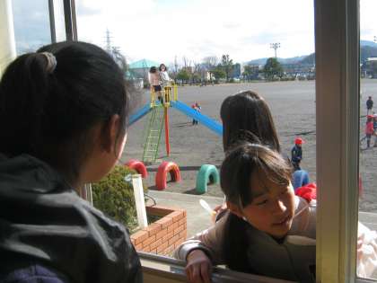 6年生との会食は、2組まで進んできました。今日は、2組の出席番号1から6番の子たちです。お話好きの楽しい子が多く、昼休みまで延長してしゃべっていきました。昼休みで校庭に出たクラスメイトが、興味津々でのぞきに来ました。滑り台の上からも手を振っています。