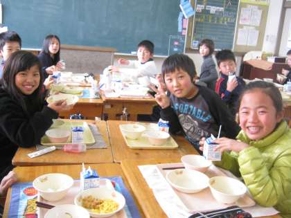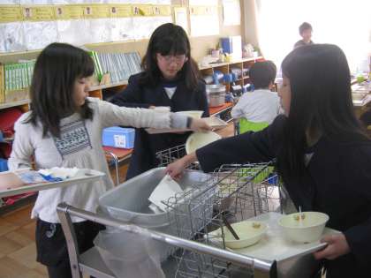 美味しくきれいに食べて、しっかり片づける。給食では、食に対する感謝の気持ちも育てています。