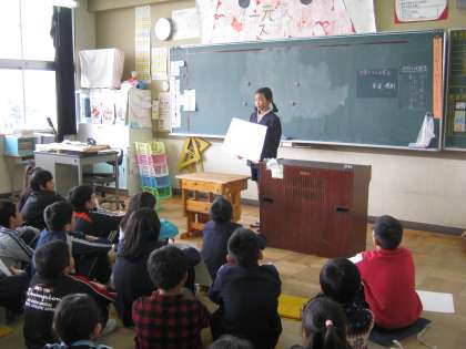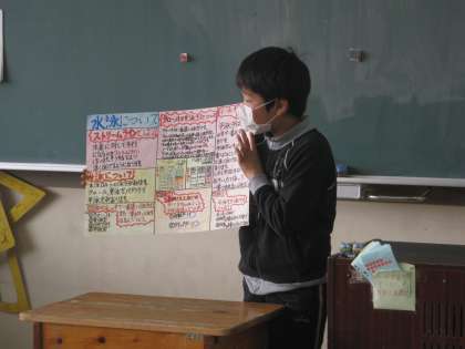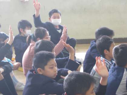 5年生が、マイプラン学習の発表会をしていました。各自がテーマを設定し、調べたことを発表します。中にはクイズもあり、挙手で答えを示す参加型の発表もありました。