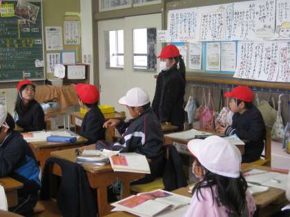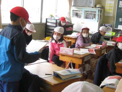 3年生の国語では、夕焼けを宝と思いこんでうっとりと見とれている鬼の子に、足元に埋まった本当の宝の存在を教えるか教えないかで、話し合っていました。意見によって赤白帽子をかぶりわけています。