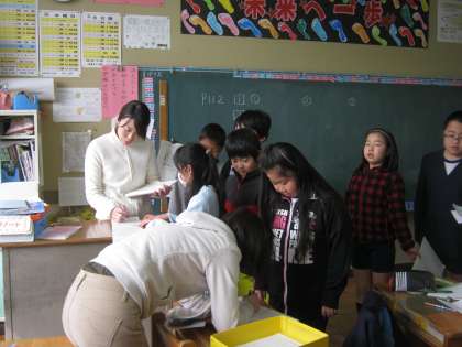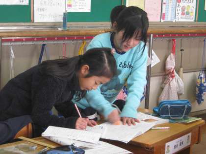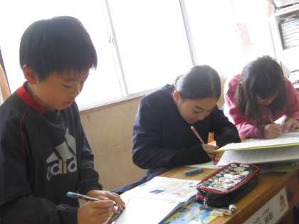 4年生は、今日は、各教室で学習していました。4年生の算数のまとめです。文章問題を読み、わからない数を□として立式し、解いていくのですが…。3年生同様、なかなかの難問です。ここの教室では先生二人で丸付けをし、躓きをみつけては指導してくれていました。