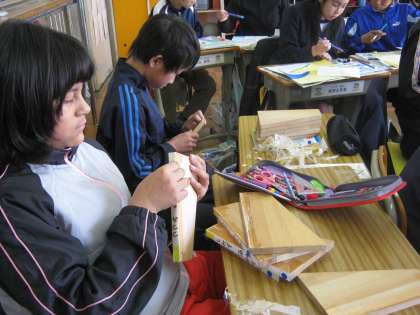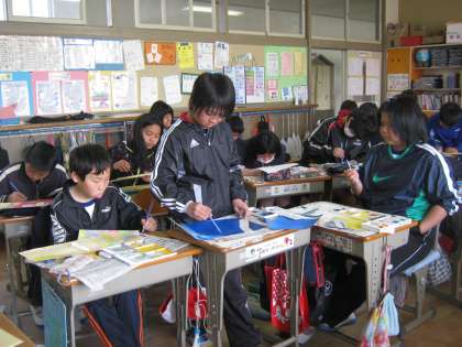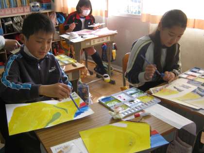 6年生が、卒業制作を進めていました。学級によって分担箇所が違うので、全体的な色合いも違います。2組は黄色っぽいところが多いようです。完成した子たちは、自分たちが使っていた代本板(図書貸出用)から名札をはぎ、新1年生用に準備してくれていました。