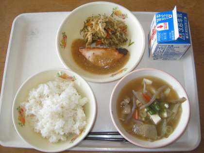 麦ご飯 鰆のゴマ味噌かけ 昆布と切り干し大根の煮付け けんちん汁 牛乳
