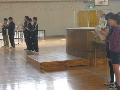 「門出の言葉」の練習は、実行委員が前に立ち、6年生にも、5年生にも助言をしながら進みます。「もう少しゆっくり行ってください。」「もっと大きくはっきり!」仲間からのアドバイスを受けて、完成度が上がっていきます。