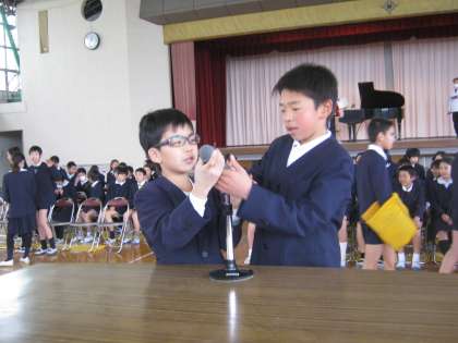 始まる前は、5年生もリラックスした表情。体育館は各種準備でざわめいていました。