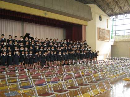 「門出の言葉」です。6年生の歌は、ますます完成度が高まり、胸に響いてきます。5年生も、精いっぱい声を張り、6年生に呼びかけます。