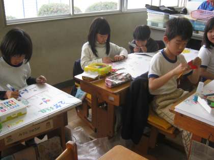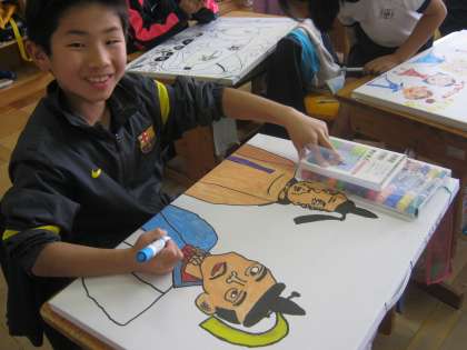 おのおの、好きな絵柄を描いていました。歴史好きの子が描いているのは、徳川家康と豊臣秀吉なんだそうです。