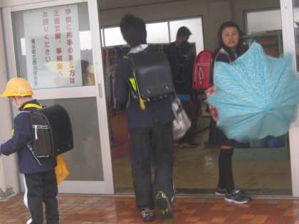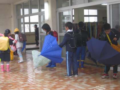 子どもたちは、児童玄関に入る前に、傘についた雨を振り落とし、傘をきちんと束ねて傘立てにつるしています。教員生活の長い私ですが、こんなに整った児童玄関は他で見たことがありません。先生方の丁寧で継続した指導と、それに応える子どもたちの意識の高さを感じます。