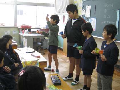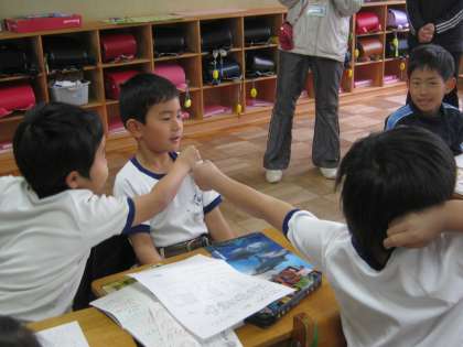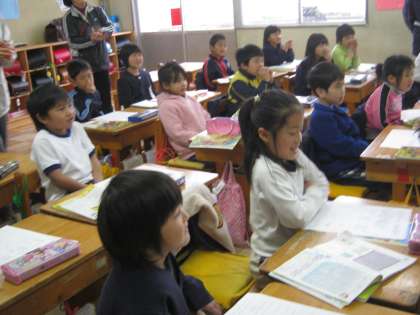 1年生の教室では、熱心に聴いて、感想も言ってくれました。手編みの座布団が、何百本もの靴下の端切れを根気よく編んで作られたものだと知ってびっくり! しかも、交流のお友達の1年生が作ったものだと知って、またまたびっくり! 「すごいねぇ。」「よくできるねぇ。」と、感心しきりでした。