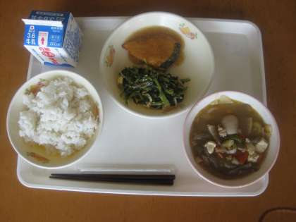 献立 さかなのごまみそかけ はだいこんのじゃこいため けんちんじる 麦ご飯 牛乳